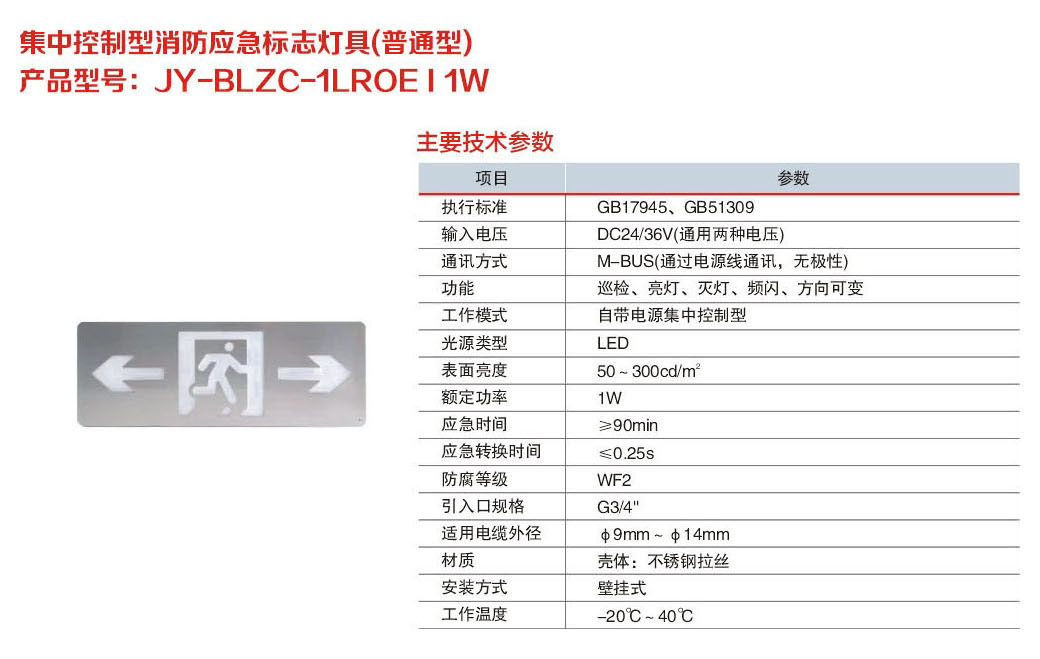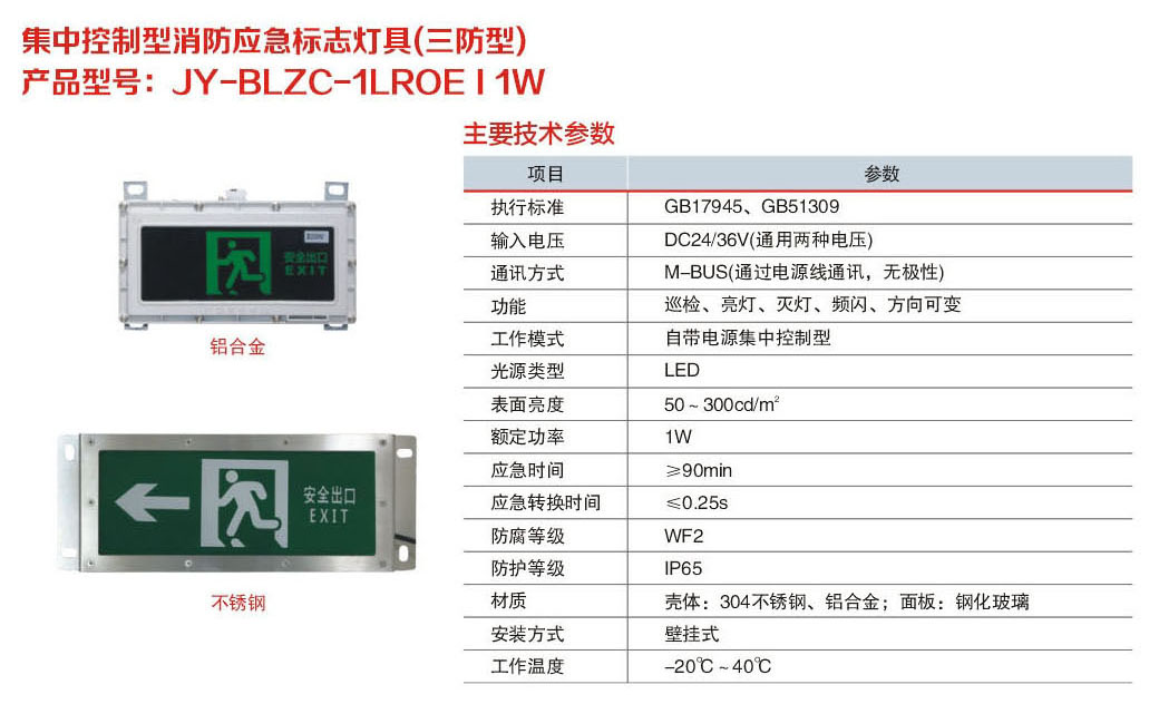 JY-BLZC-1LROE I 1W自帶電源集中控制型消防應急標志燈具(三防型、普通型)
