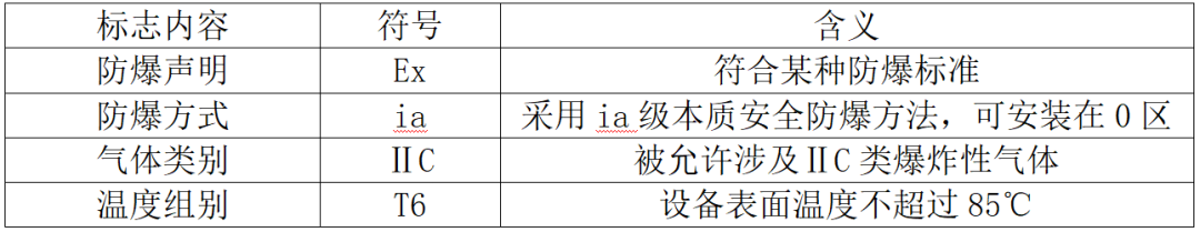 帶本質安全型“i”(EPL Ga)輸岀電路的隔爆外殼Ex元件“d”(EPL Gb),用于除易產生煤礦瓦斯氣體外的C級爆炸性氣體環境(防爆合格證編好后加符號“U”):Ex d [ia Ga] ⅡC Gb 或 Ex db [ia] ⅡC 。