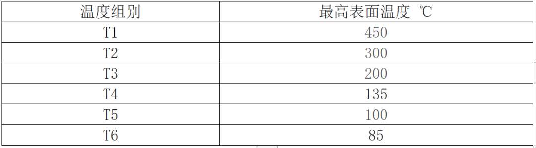 對于高表面溫度超過450℃的電氣設備應用攝氏溫度來標記高表面溫度,例如,600℃。用于特殊氣體的Ⅱ類電氣設備,不必標岀相應溫度組別或高表面溫度。